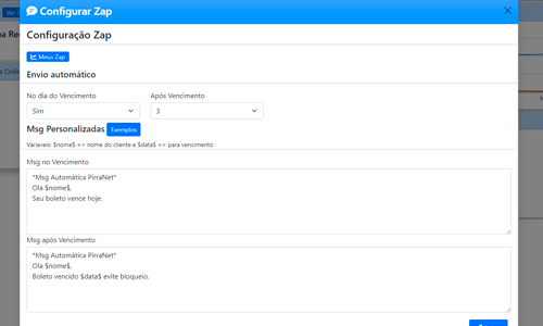 Dia do Vencimento: selecione sim para enviar alerta para o cliente no dia do vencimento. Após Vencimento: selecionar a quantidade de dias que será enviado Zap após o vencimento.