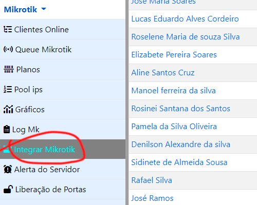 No Menu do lado esquerdo clicar em Mikrotik, depois Integrar Mikrotik.