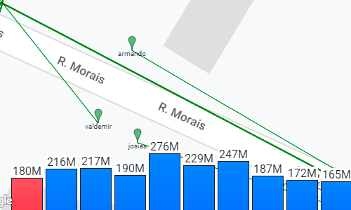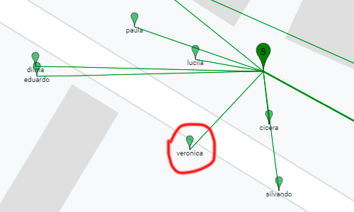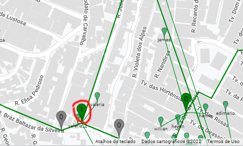 Clientes: Representado pelo marcador menor, e as linhas são ligadas direto à CTO configurada. Cor Verde: Quando estiver online. Cor Vermelho: Quando estiver Off. Cor Amarelo: Quando estiver on porém bloqueado.