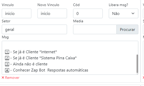 nesse caso iremos captar o numero 1 e o vinculo de onde veio que seria "inicio" e para onde vai "Novo Vinculo" digitamos "cliente" caso o cliente digite os numeros que iremos informar no texto.