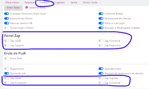 home configurações depois usuários e marque as opções em Painel Zap, deve também marcar Envio de Push e selecionar os zap.